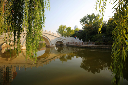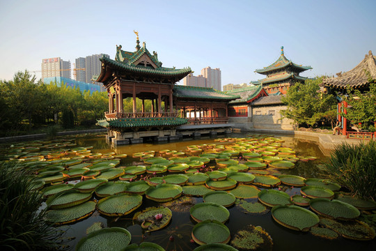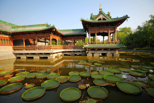 整個公園圍繞迎澤湖佈局,周圍及湖心點綴精品古建築,遊客漫步其中賞亭台樓閣、小橋長廊,感受庭院深深的閒趣。