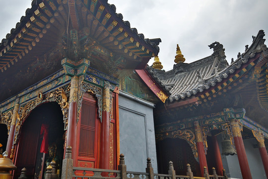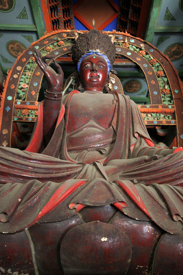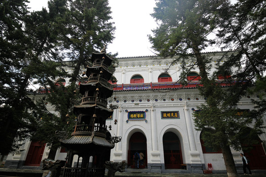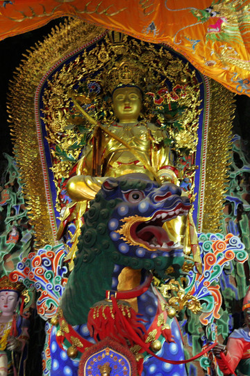 殊像寺沒有大雄寶殿,只有大文殊殿。現存殿宇為明弘治二年(1489)修建的,是五台山台懷中心區最大的殿宇。殿內正中佛台上供奉的文殊騎獅塑像,高近十米,是五台山諸寺中最高大的一尊文殊塑像。