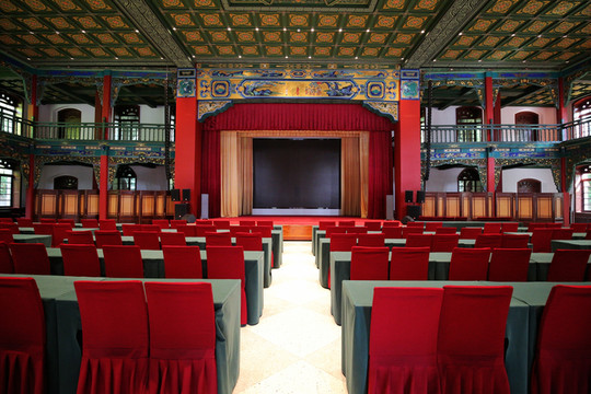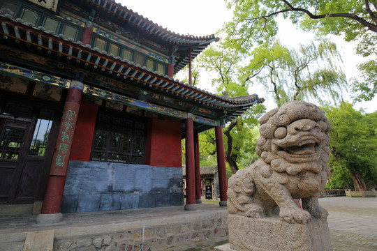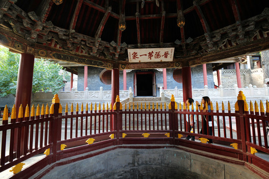 三是“水鏡台”,水鏡台位於中軸線最前端,始建於明朝。初來晉祠的遊覽者,會將水鏡台的背面(正對大門的一面)誤認為是正面,其實繞過去一看就明白,這是一座坐東朝西的古戲台。從建築結構上看,水鏡台體現了殿、台、樓、閣四種風格。從東邊看去,上部為重簷歇山頂,它像座樓;下部為寬闊的宮殿形制,它又是殿。從西邊看去,上部是單簷捲棚頂,像座閣;而下面又是寬敞的高台。這是一座由殿樓和捲棚合而為一的特殊建築。後半部分單簷捲棚頂樓台式正是演劇的前台,據說台下埋著許多大水缸,每兩個扣在一起,形成4個“大音箱”,這是古代一種增強音響效果的方法。因為有了這大甕音箱,觀眾不論站在廟裡何處,都能聽到台上的聲音。