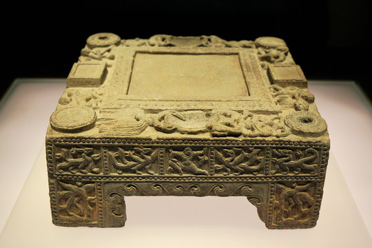 北魏石雕方硯,1970年山西省大同市南郊北魏建築遺址出土。此硯用淺灰色細砂岩石雕成,造型優美,正中突出長、寬各12厘米的方形硯盤,以聯珠紋和蓮花紋作花邊。這件石雕方硯造型精巧,雕刻繁複,構思奇妙,嚴整敦實,是北魏石刻藝術的高水平佳作,堪稱傳世的同時代最為精美的代表器物。