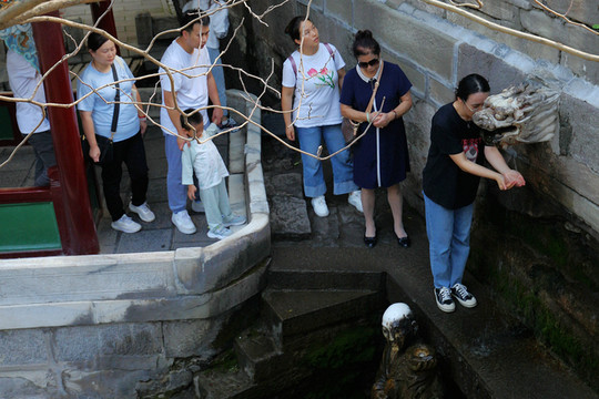 三是難老泉,在聖母殿南面,有一座北齊天保(公元550—559年)創建的難老泉亭,八角攢尖頂。晉水的主要源頭難老泉水從亭下石洞中滾滾流出,常年不息,晝夜不捨,故北齊時期取《詩經·魯頌》中“永錫難老”的錦句為名,稱難老泉。泉下面的龍頭滴水處,有許多遊人接水祈福。