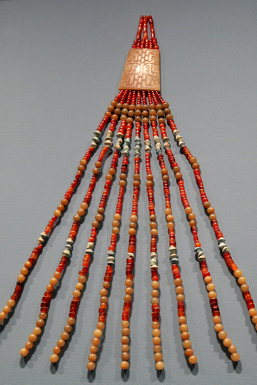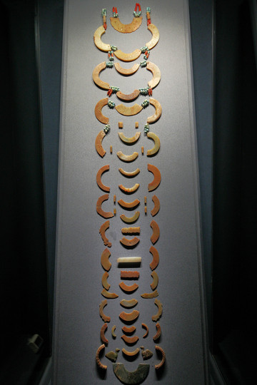 玉牌聯珠串飾,1992年曲沃縣北趙村晉侯墓地出土。由玉牌、玉珠、瑪瑙珠、料珠組成,共有584件組成。玉牌呈梯形,正面用雙勾法刻有對稱的龍紋,線條婉轉、流暢。上下穿孔均為側、背斜鑽。墓主人為晉獻侯夫人。