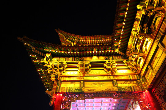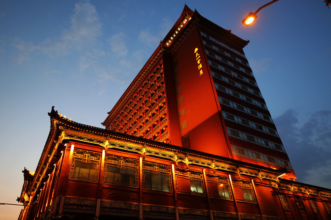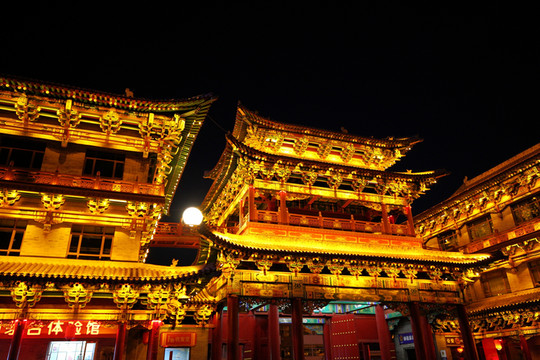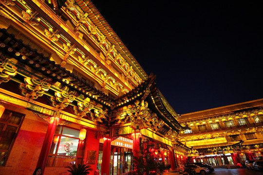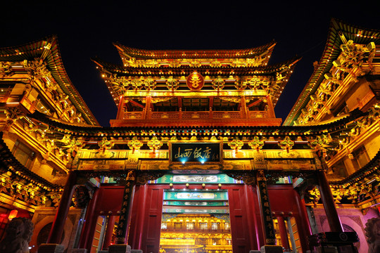 接下來去的山西飯店才是太原夜色的天花板,整個建築群雕樑畫棟,在燈光的襯托下金碧輝煌。