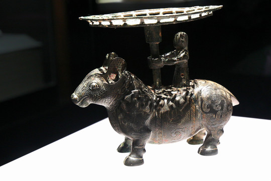戰國銅犧立人擎盤,1965年山西長治市分水嶺出土。盤為圓形,侈口,平底,下接支柱,可以靈活轉動,盤底以鏤空蟠虺紋裝飾。犧牲體肥碩,面部表情溫順,雙目圓睜,長吻大耳,四足短而粗壯,站立平穩,牲背上站立一人,面目清秀,束髮垂脊,身穿右衽長袍,雙臂前伸,手握盤柱。 “犧”是古代祭祀所用牲畜的稱謂。