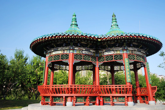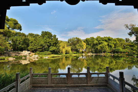 四美亭,青瓦捲棚扇形亭,面闊五間,西壁設四大美女(西施、王昭君、貂蟬、楊玉環)磚雕,三週勾欄,設美人靠,為遊人休息涼亭,在此觀景暢抒幽情,景緻最佳,故有良辰、美景、賞心、樂趣“四美”的雅稱。