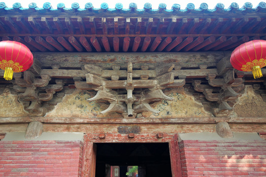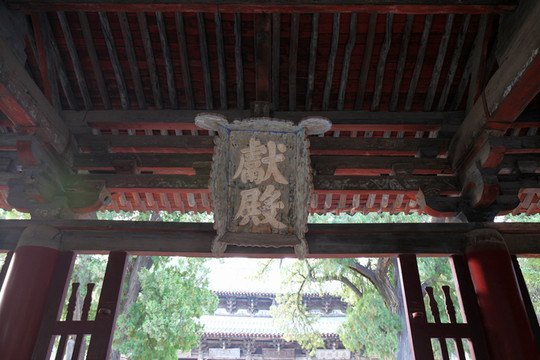 三是獻殿,建於1168年(金大定八年),1594年(明萬曆二十年)重修,原為祭祀時陳列供品的場所。面闊三間,單簷歇山頂。前簷明間敞門,四周檻牆,上至直櫺柵欄。四角結構合理,堅固耐久,店內敞朗,外觀穩固而舒展。是中國古代建築中的瑰寶。