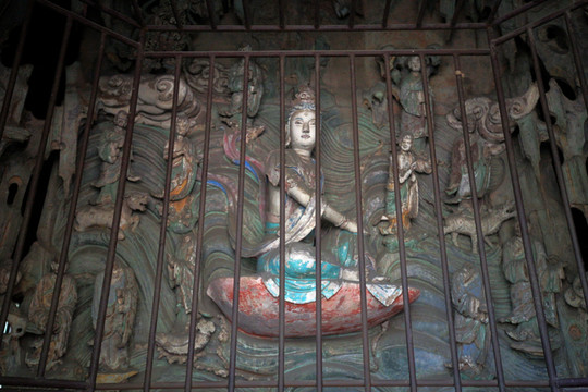 萬佛殿內的觀音像被塑造成面容秀麗、姿態優雅的完美女性。該雕塑是明代塑造的,面向北方倒坐表明了觀音菩薩不渡盡眾生,永不回頭的大慈大悲。