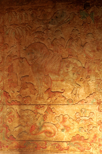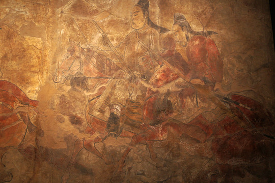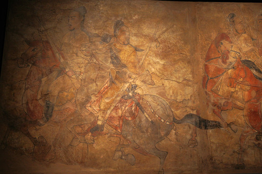 太原婁睿墓壁畫《鞍馬出行圖》,北齊繪畫最具代表性的作品。墓主婁睿,鮮卑人,北齊世祖高歡妻婁太后兄壯之子,是一位很有影響的歷史人物,武平元年(570年)入葬。所繪內容為墓主人生前豪華顯赫的生活場面及死後飛升天界的空幻境界。該作品完全擺脫了秦漢以來壁畫墓的刻板程式,採用寫實主義的創作手法,添補了我國美術史上北齊繪畫的空白。仔細看畫面中央的那匹馬的眼睛,刻畫尤為生動,可以無死角凝視著不同角度的參觀者,我嘗試從不同角度去觀看,果然如此。