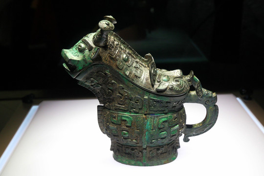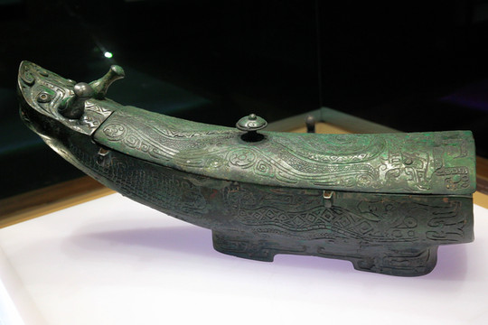 龍形觥,1959年山西省石樓縣桃花者村出土。這件器形獨特、紋飾奇絕的青銅器,宛如一艘停泊在水波里的龍舟。龍形觥獨特的造型與花紋裝飾,與同時期典型的中原文化風格相區別,龍形觥所屬的桃花者村遺址就是商代晚期方國文化系列。器身口沿外附有兩對貫耳,用來把龍形觥吊起加熱酒,另一端沒有封口是用來散水蒸氣的。器身紋飾華麗精美,比較稀有的是器身兩側分別刻畫有一條鱷魚的圖案。