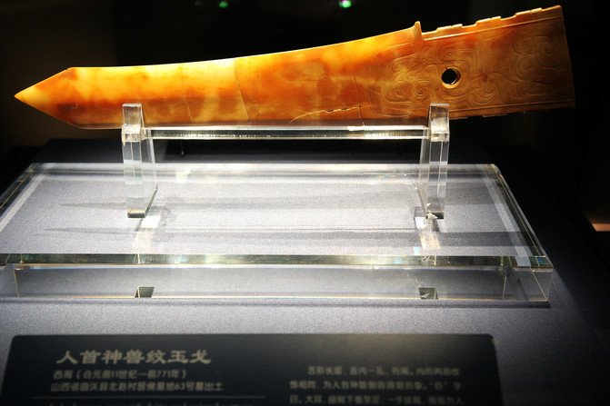 人首神獸紋玉戈,1993年山西曲沃縣北趙村晉侯墓地出土。內部兩面雕刻相同的紋飾,以雙勾技法為主。側面人首神獸形象,頭披長發,大耳圓鼻,臣字目,大獠牙,長髯及足,利爪長尾。頭髮絲線雕琢精細,每毫米並列5~6條。此戈紋飾題材詭異,雕琢技藝高超。墓主人為晉穆侯次夫人。