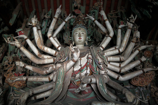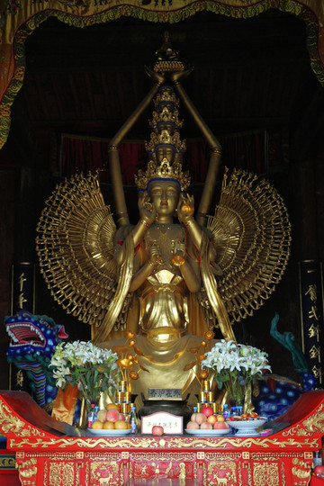 菩薩殿在中院西側,主像為二十六臂觀世音,結跏居中而坐,儀容豐滿端莊,神態溫柔雋逸,手勢富於變化。菩薩雖多手多臂,但並不使人感到不自然,相反形象的端麗嫻雅、雍容大度,卻慈祥感人。