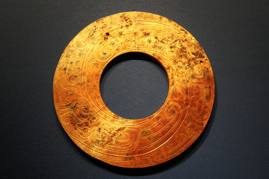 西周龍紋玉環,山西曲沃縣北趙村晉侯墓地出土。兩面相同,刻兩條蟠卷龍紋。雙龍首尾相追於渦旋線和卷雲紋之間。雙龍之間的空間刻有捲雲紋。紋飾皆以雙鉤技法雕琢,線條婉轉流暢又富於變化。墓主人為晉穆侯次夫人。
