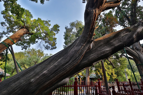 晉祠三絕:一是周柏唐槐,參天古樹周柏,老枝縱橫,盤根錯節,位於聖母殿左側,相傳為西周時所植,距今已有2700多年。樹身已向南傾斜近乎倒伏,但仍充滿了生機。