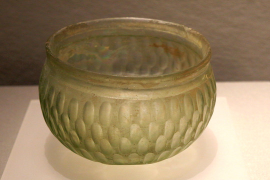北魏玻璃碗,1988年山西大同市南郊出土。波斯薩珊王朝飲器。外壁磨飾出縱橫排列有序的橢圓形凹面,圜底,飾7個較大的圓形凹面。玻璃器在現代不算什麼稀罕物,但在古代,卻是難得一見的寶物。