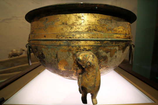 西漢胡傅溫酒樽,1962年出土於山西右玉縣大川村,通體鎏金。蓋中央有提環,周有三鳳形鈕,熊形三足。腹部飾上下兩層浮雕動物紋,有虎、羊、駱駝、牛、猴和龍、鳳等神異動物十餘種。器口與蓋下子口沿陰刻銘文:“中陵胡傅銅溫酒樽,重廿四斤,河平三年(公元前26年)造”。此器形制端正大方,紋飾精美,動物形象逼真,即具有北方草原文化特色,又不失中原的典雅之風,此種胡漢風格融於一器的精美文物在全國范圍內亦屬罕見,是研究漢代銅器鑄造、量器製度、鎏金工藝及美術史的實物資料,是漢代青銅藝術和技術的典範之作。