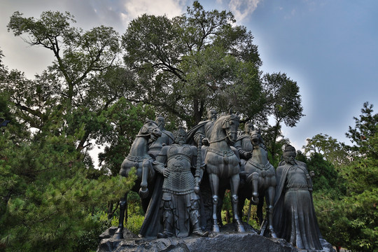 跨過牌坊一路走來,經過唐園首先看見的是飛龍閣,整體建築坐落在假山石洞上,從假山石洞下穿行而過,就來到了龍興晉陽群雕前,雕塑講述了李世民的戎馬一生,展示了唐王朝與晉祠的歷史淵源,晉祠也是大唐的龍興之地。2003年,值太原建城2500年之際,塑鑄這組青銅塑像。中間騎馬者為唐太宗李世民,左側為國舅長孫無忌,右側為李勣,前面為尉遲敬德,最北側兩位前是魏徵,後為馬周。