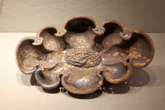 北魏八曲銀洗,1970年山西省大同市南郊軸承廠窖藏出土。這件八曲銀洗每一曲都在器腹凹入較深,在口沿處又向器內側深深盤曲,形成小彎,彎口處飾忍冬紋。銀洗用錘揲技法在洗心打製出海獸紋,八曲花口式杯口,圈足亦為花瓣形,在銀洗口沿下還有文字,據考證這行銘文是大夏(今阿富汗)文,而最後四個字母現僅可釋讀“XOSO擁有”,疑為是所有者的名字。5至6世紀大夏銀器在國內極少見,其風格直接影響了唐代的金銀器。 這件八曲銀洗紋飾樸素,形制獨具特色,保存完好,波斯薩珊王朝器物,目前歐洲還存有幾件同一類型器物,極其罕見,是目前國內最早的一件多曲長杯。