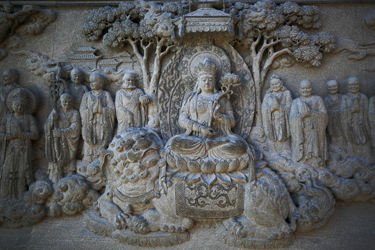 文殊菩薩來到東海,見龍宮外面果然有一塊巨石。還沒有走到跟前,已經感覺到一股涼氣迎面撲來。文殊菩薩見到龍王,說明來意。