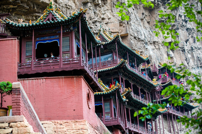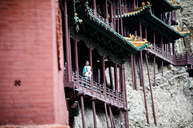 從遠處看,懸空寺的樓閣就像貼在峭壁上一樣,僅靠柱子支撐,整片樓閣似乎一不小心就會崩塌。