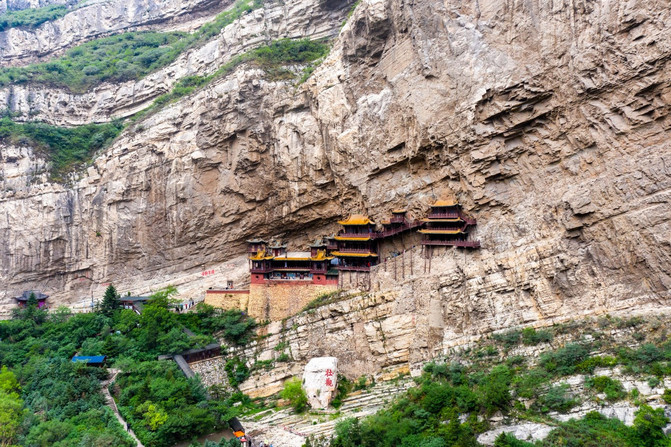 試想在機械水平極其落後的北魏,工匠們從山頂上綁繩子吊下去建造寺廟,這有多費勁,難度有多大,懸空寺全靠插進山里的橫梁來承受重量,縱向的立柱有的甚至是活動的,以前不限流的時候,近千人都沒有把寺廟壓塌,可見其牢固性,難怪詩人李白也留下了“壯觀”的題字,還在壯字上多了一點,表示溢美之情。