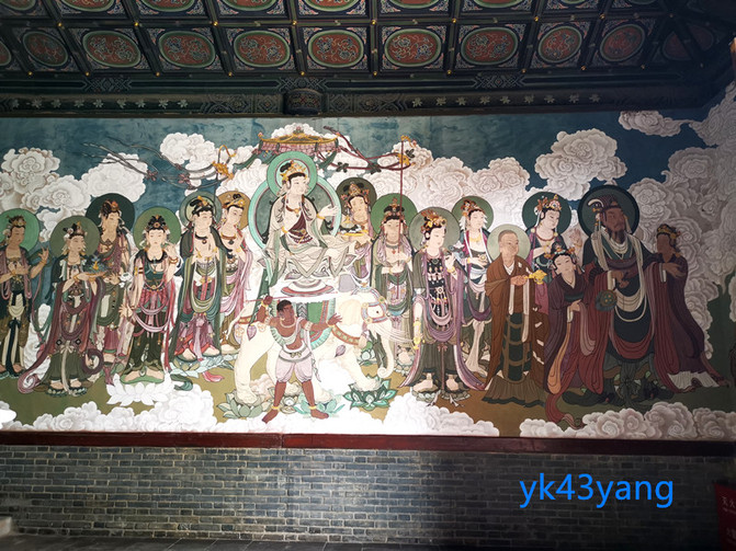 大殿牆上,還有康熙年間所繪的壁畫,都是佛經故事。殿內光線不好,難以看清。管理人員教了一個辦法:將雙手虛握拳,像看望遠鏡似地放在眼前。果然,因為沒有了周圍強光的干擾,壁畫看得很清晰。