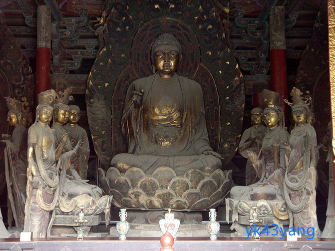 大殿正面供金身五方佛,其中,中間三尊香木,兩邊兩尊泥塑,盡是明代原物。五佛端坐蓮台,背露佛光,一派金色燦爛,盡現佛國莊嚴。佛前立著一尊接引佛,接引眾生,往生西方淨土。