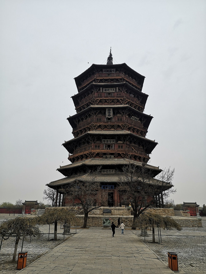 【應縣木塔】【懸空寺】都在大同市區南邊,可放在1天。應縣木塔在大同西南側的山西朔州應縣,已出了大同,距大同市區約80km,車程1個半小時左右。提示一點,導航千萬別選應縣木塔停車場,這個車場是新修的,距木塔還要走路1公里多,而且要收10元停車費。唯一對電車比較友好的是裡面有充電樁。可以直接導航應縣木塔。木塔邊的路邊有劃停車位,可免費停車。木塔不能登塔,只能在外面看下,或者進一層看下里面的佛像。要想登塔,可去古城華嚴寺裡登下華嚴寶塔。就因為頭天晚上看小視頻上有人講,說木塔矗立千年而不倒,當地有個傳說,木塔的24根柱子每隔一小時就有一根柱子在休息。因為這,閨女硬是在這待了2個小時,看是不是有柱子在休息。