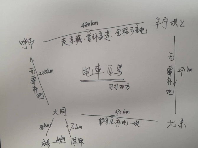 北京到大同全程高速,370km,全程高速服務區基本都可充電,正常行駛時間大概在4-5個小時,中間要補電1次,大概1小時。