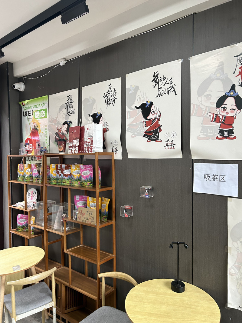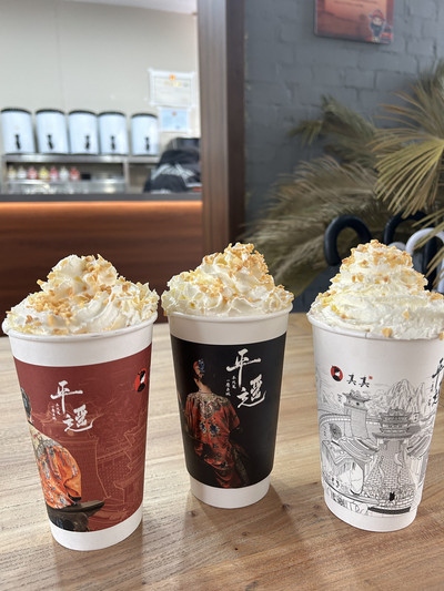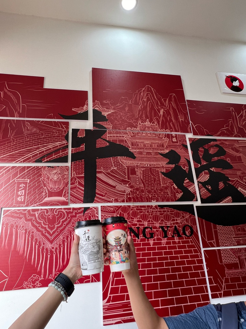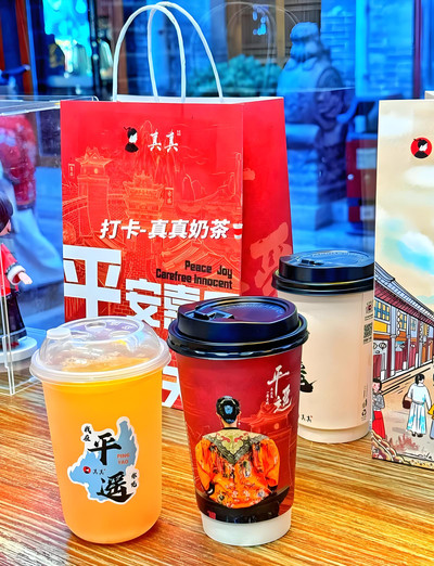 我望著精緻的海報、可愛的“真真”玩偶,心情也變得更加舒暢。閨蜜則是輕輕把玩著包裝袋,只見上面描繪著古城風光,平增添了幾許文藝、歷史氣息。我們隨即點了兩杯真真奶茶,我喜歡芭樂三重檸味道,清閨蜜則點了桃花紅杏花白。