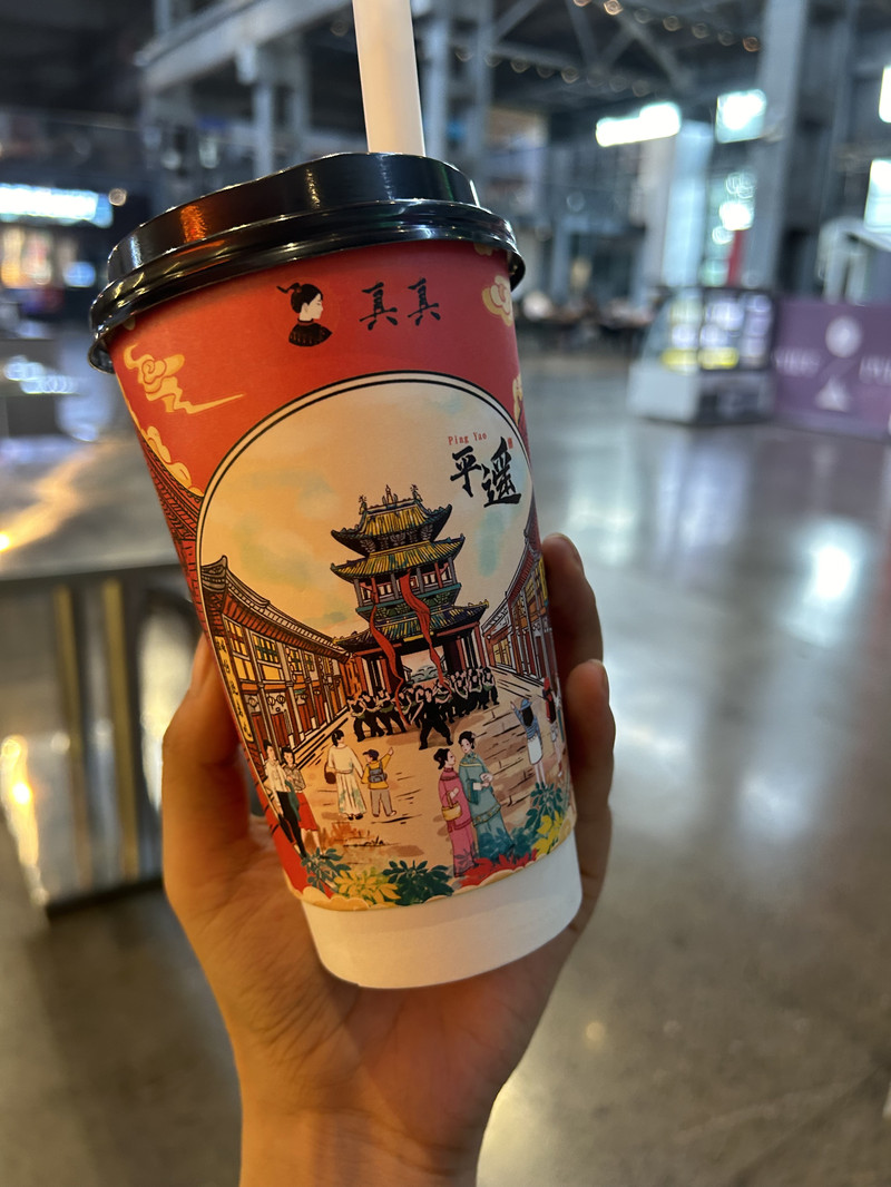 逛了好幾個小時,我感覺又口渴又飢餓。街頭的店鋪鱗次櫛比,讓我感覺眼花繚亂。思來想去,我走進了真真奶茶店,購買了一杯桃花紅杏花白奶茶,清爽綿密、甜度適中。讓我眼前的一亮的是,真真奶茶的外包裝,蘊含著慢慢的平遙文化元素,濃郁的古風氣息迎面而來。至於午餐如何解決,我毅然走進了餐廳天元奎。