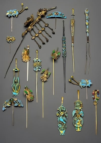 鎏金鑲寶琺瑯鳳簪是清代首飾中的瑰寶,也是今天我們的重點介紹對象。這枚鳳簪的主體部分採用銀質材料,表面鍍上一層金色,熠熠生輝,展現出非凡的視覺效果。這枚鳳簪以鳳凰為主題,寓意著吉祥和尊貴。