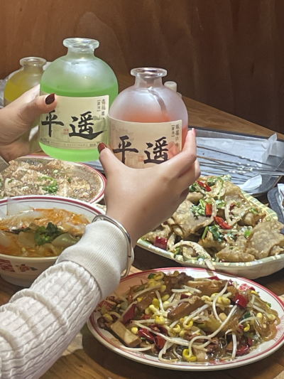 還喝到了當地的平遙果酒,櫃子裡擺著十幾種口味,每一個口味的顏色都不一樣,包裝很好看,磨砂瓶身上印著平遙兩個字,味道也不錯,清甜的果香和淡淡的酒香融合,酒精度數也不高,女生也可以淺嚐幾杯哦。