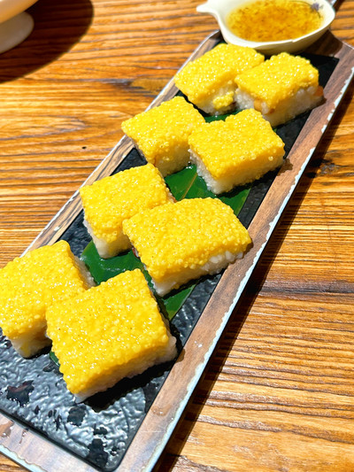 黃米涼糕:上面是金黃的小米,中間夾著葡萄乾,下面是一層小米,蘸上清甜的桂花蜜,糯嘰嘰的超好吃~