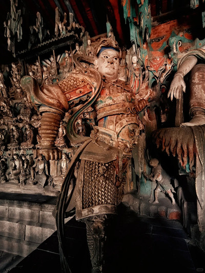 韋陀像,極富個性特徵,武中蘊文,頗具動勢,是明代彩塑中少見的藝術傑作。