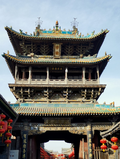 市樓位於古城的中心位置,貫穿南大街南北,是古城內唯一的閣樓式高層建築,風格別具特色,是研究平遙城市發展史、建築史的重要實物。屋頂的南北兩面,分別用黃藍亮色的琉璃瓦鑲嵌出南“囍”和北“壽”的文字圖案,更賦予市樓深刻的文化內涵。