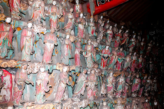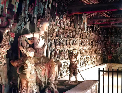 各殿內彩塑林立,共計兩千餘尊,這些彩塑大小不一,大的高達3米,小的僅10餘厘米或莊嚴肅穆,或慈眉善目,或威武勇猛,每尊都栩栩如生。雙林寺彩塑堪稱一絕,被譽為“東方彩塑藝術寶庫”,是明代塑像中的傑出代表。