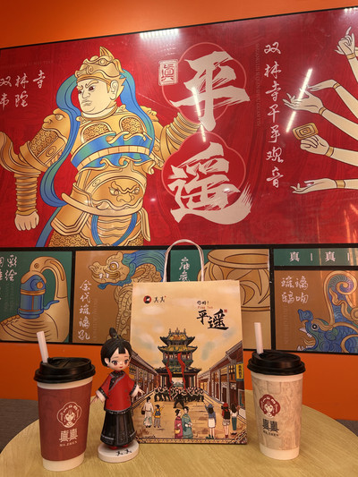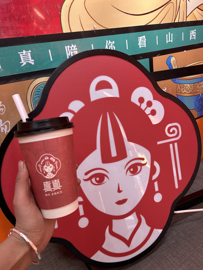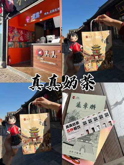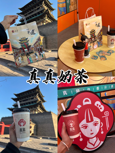 真真奶茶作為平遙的本土奶茶店,憑藉其獨特的口味、滿滿的晉商風格,迅速成為了遊客們的心頭好。店內的招牌茶飲桃花紅杏花白,將山西的特色食材與奶茶完美融合,入口既有濃郁的奶香,又帶著淡淡的花香和果香。