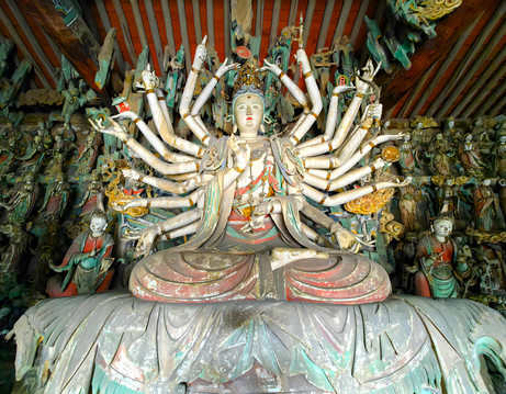 千佛殿是彩塑最為集中的地方,殿內彩塑多達500餘尊。主像自在觀音獨具特色,她右腿屈蹲,左腳輕踏蓮葉,重心落於左胯;右手微抬微翹,左手支撐身體,身體自然向左傾斜。