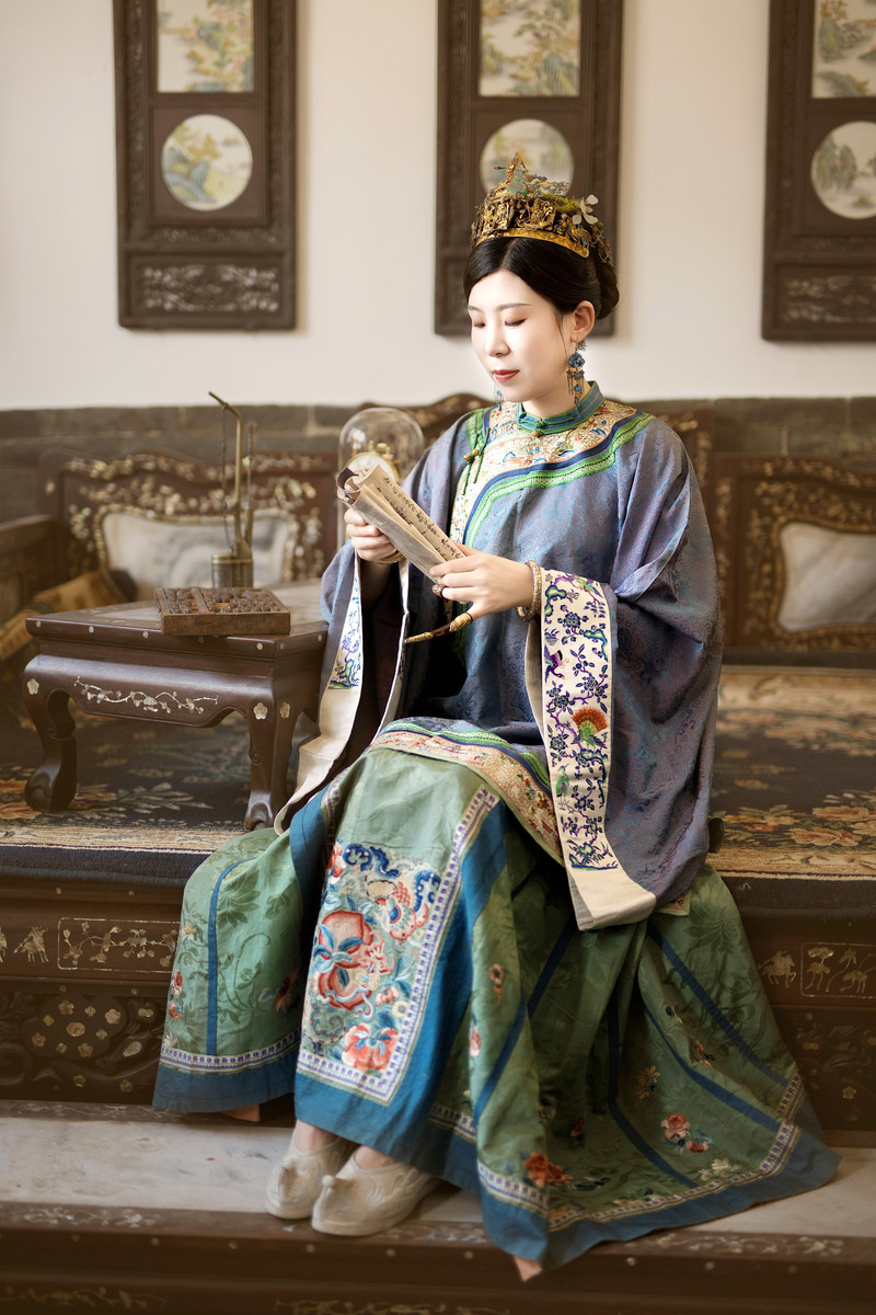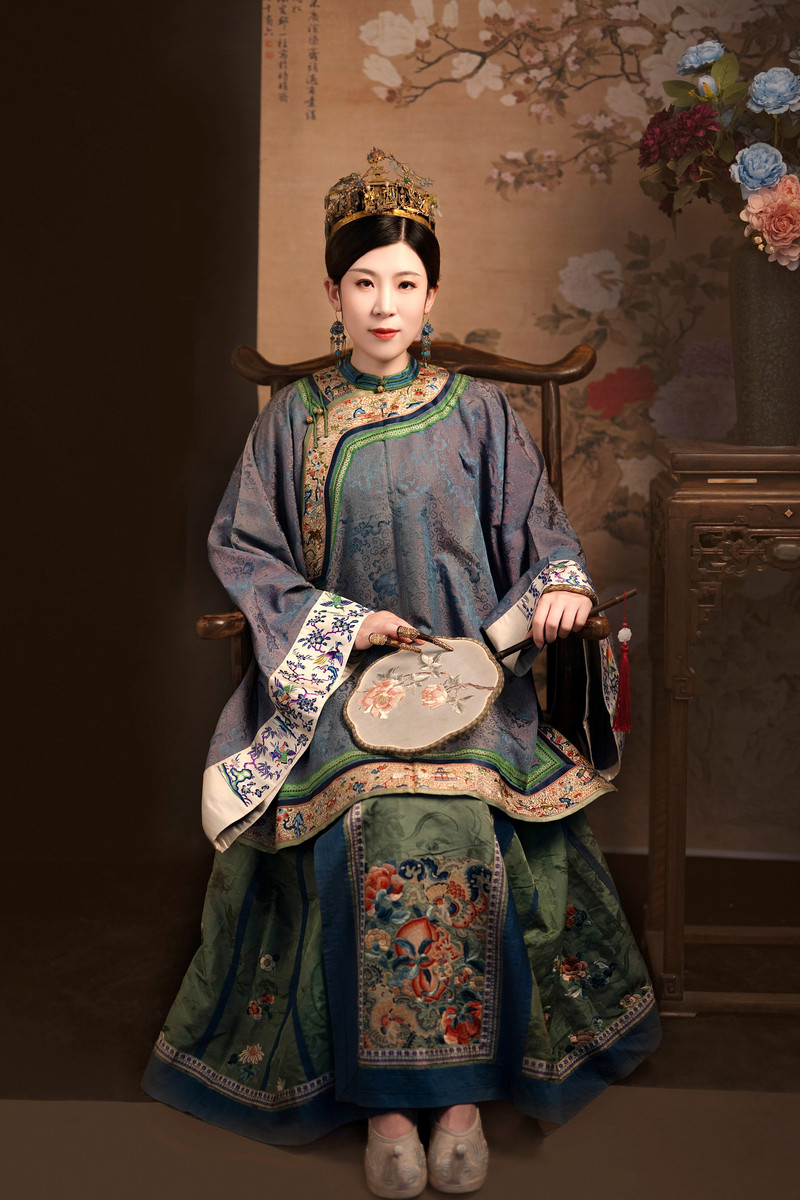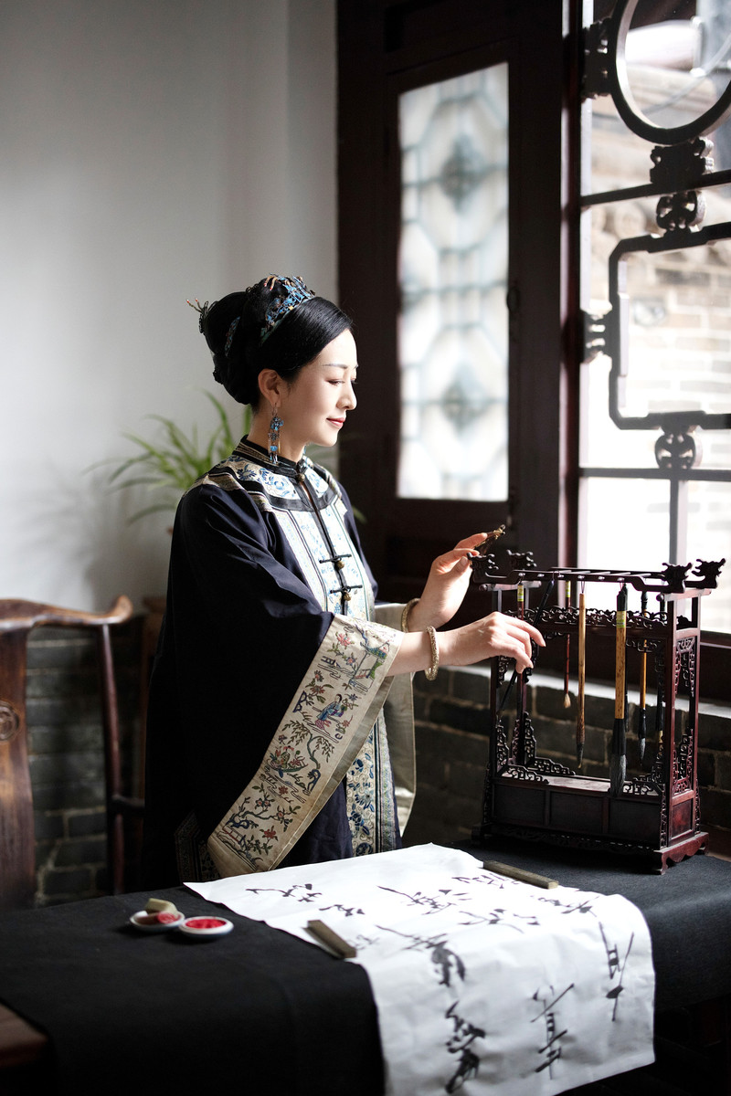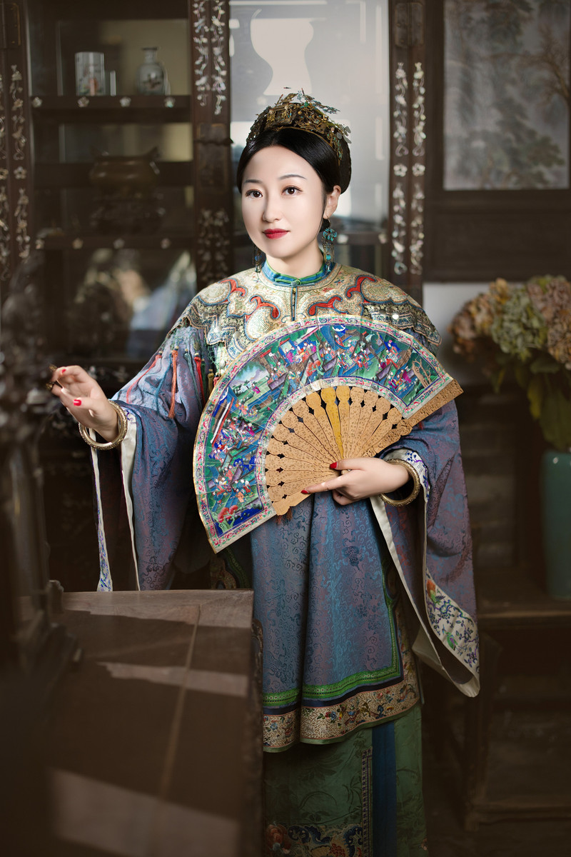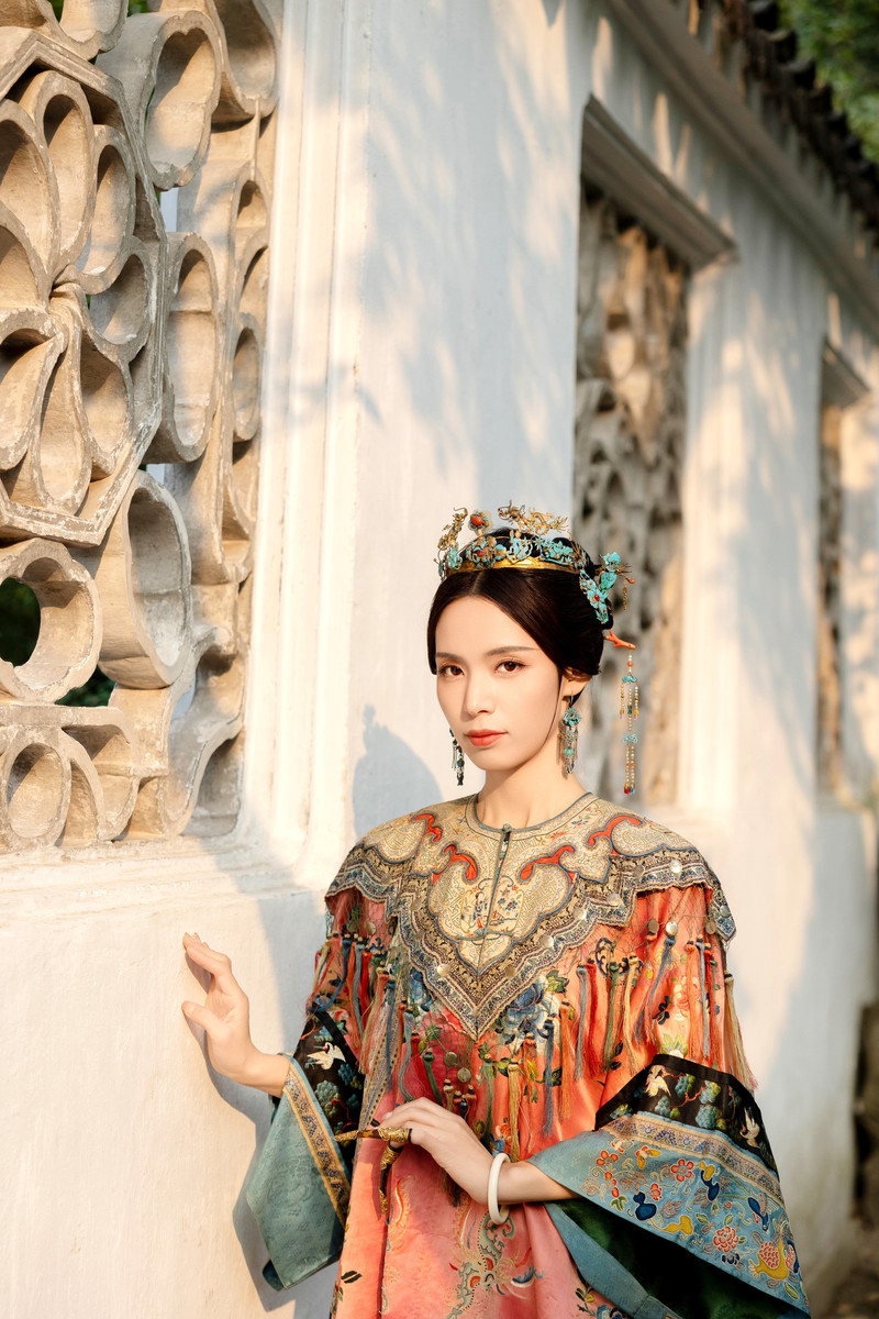 在店員的推薦下,我選擇了“籠中鳥”套裝,這套服飾上的蘇繡精緻細膩,讓人愛不釋手。換上古董衣,再戴上文物級的點翠頭飾,我彷佛真的變成了一位晉商大小姐。