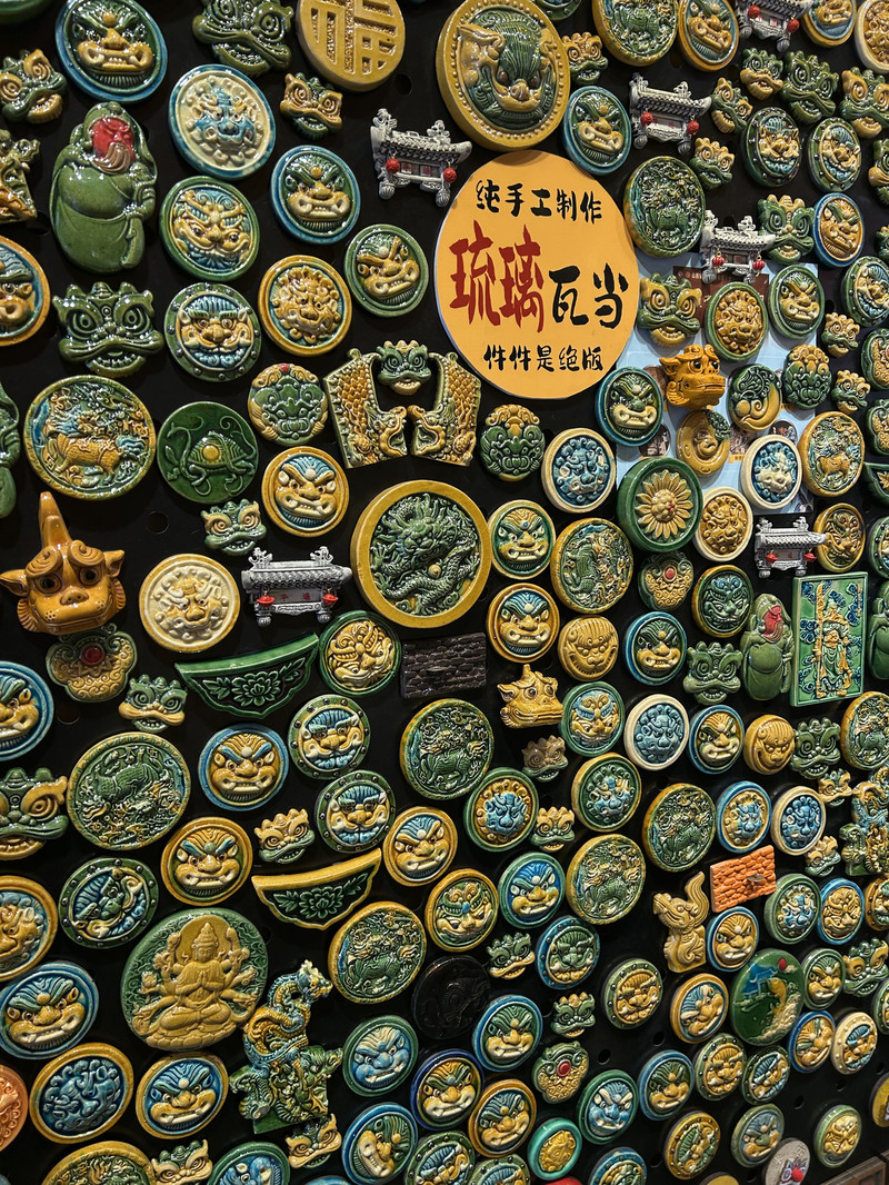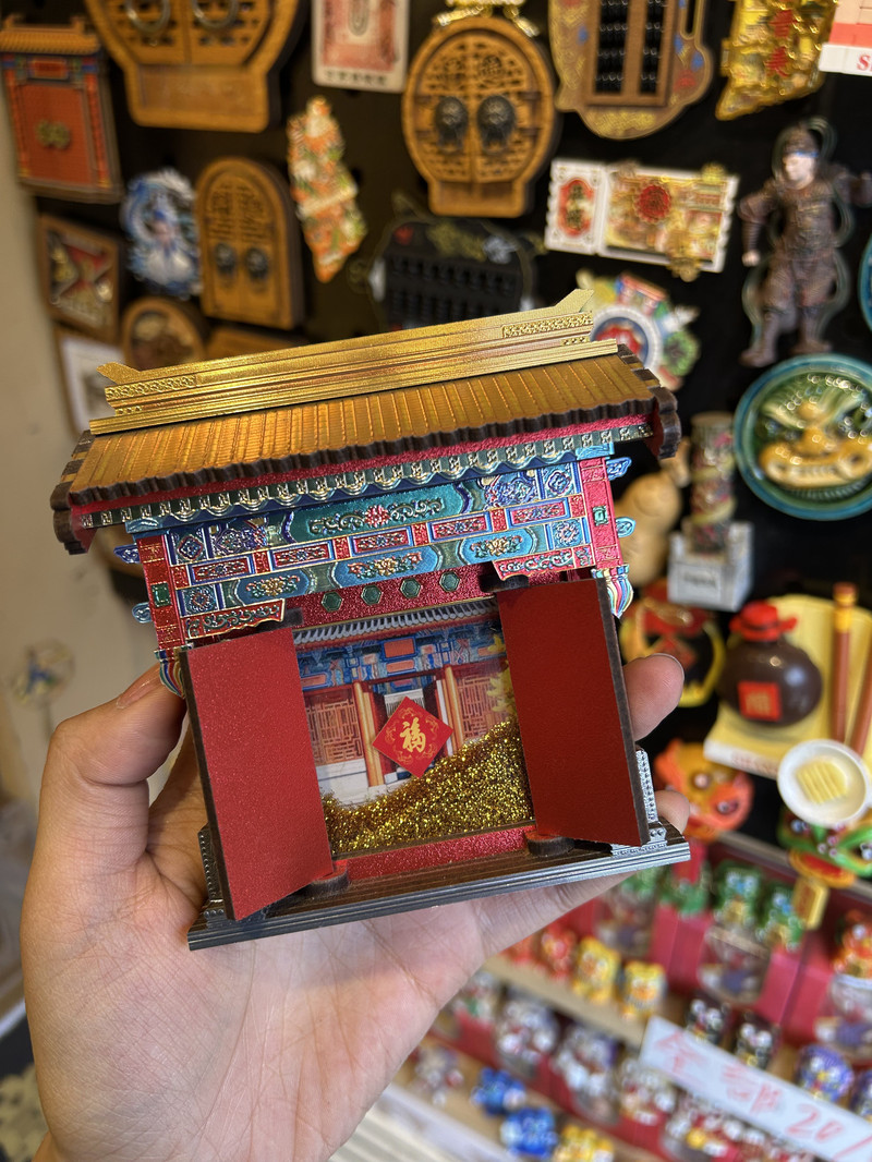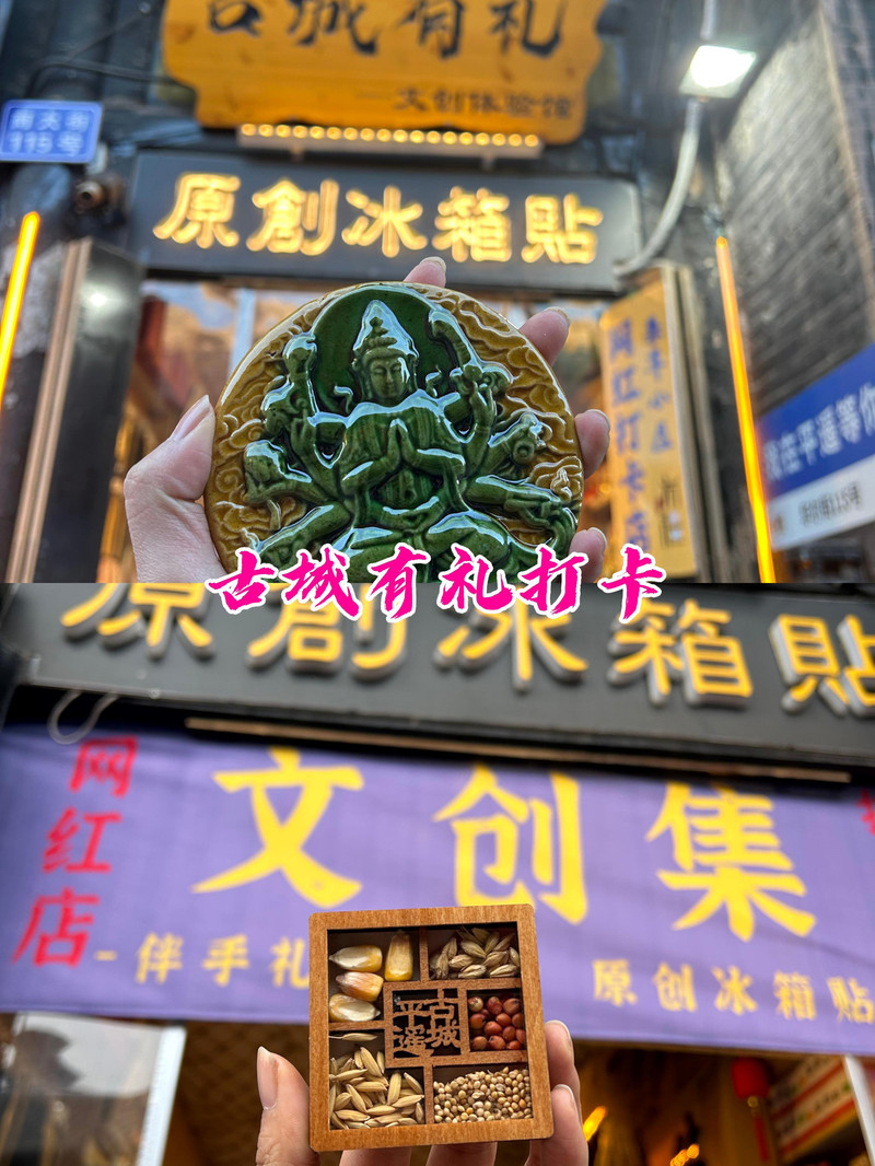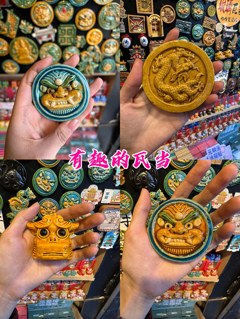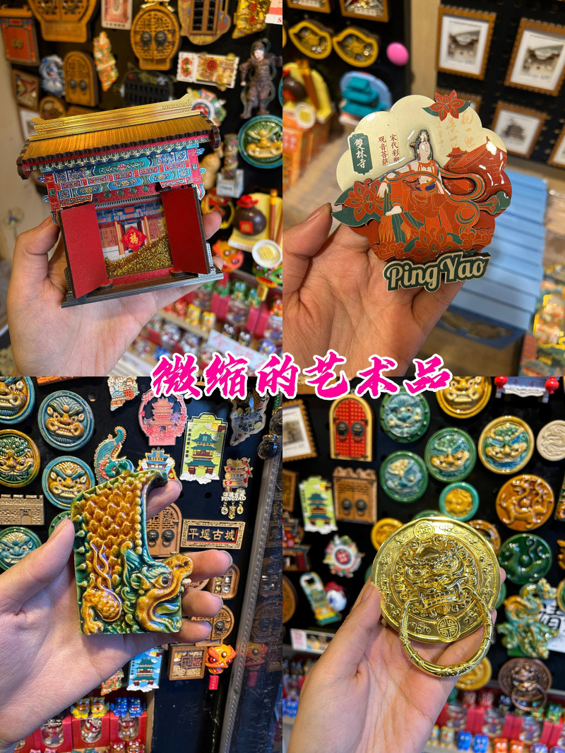 倘若說冰箱貼是旅行者的“戰利品勳章”,那麼“古城有禮”絕對是我們的終極戰場!左手邊整面牆被施了“縮小咒語”,只覺鎮國寺的斗拱、雙林寺的自在觀音衣袂、古城牆的磚紋,全被復刻成掌心大小的藝術品。