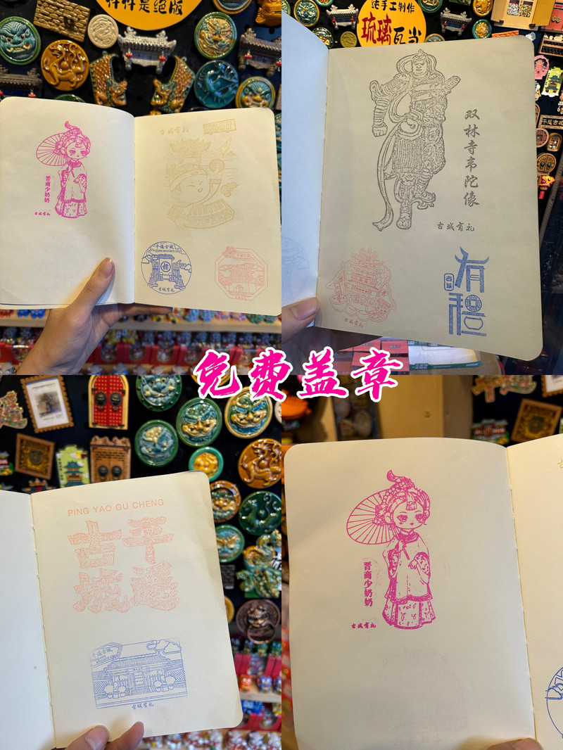 古城有禮的門口是免費蓋章區,蓋戳本攤開在桌上,每頁都印著平遙的地標,例如日昇昌的金算盤、協同慶的神龍柱、平遙縣衙的獬豸……我抄起蓋章本狂蓋,心中洋溢著久違的滿足與愜然。