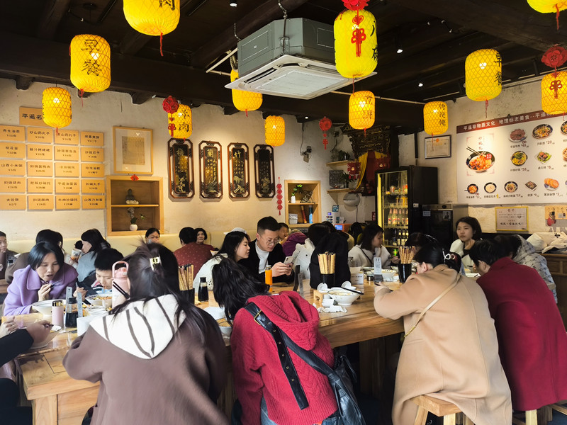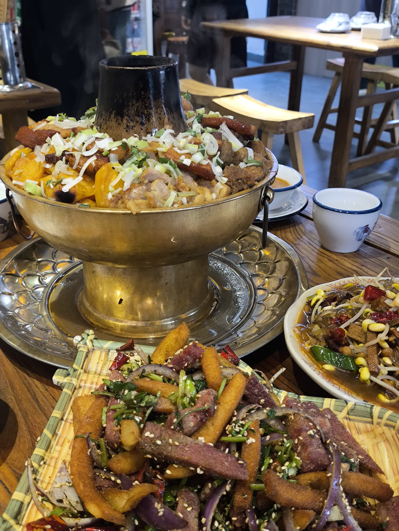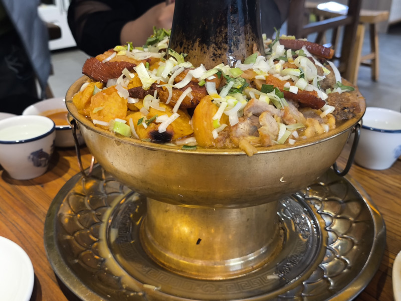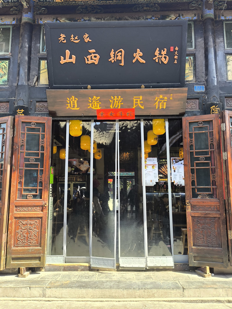 位於平遙古城南大街112號,他家的“旱火鍋”是招牌必點!和平時吃的川渝紅油火鍋完全不一樣,吃得邊吃邊涮的火鍋,而是先把食材都放在銅鍋裡,食材也很豐富,有燒肉、丸子、酥肉、豆腐、白菜、寬粉、海帶等層層堆積,湯底是可以喝的高湯,味道正宗,還有自製蘸料可以蘸著吃~除了銅火鍋,還有烤串、炒菜、麵食可以點。
