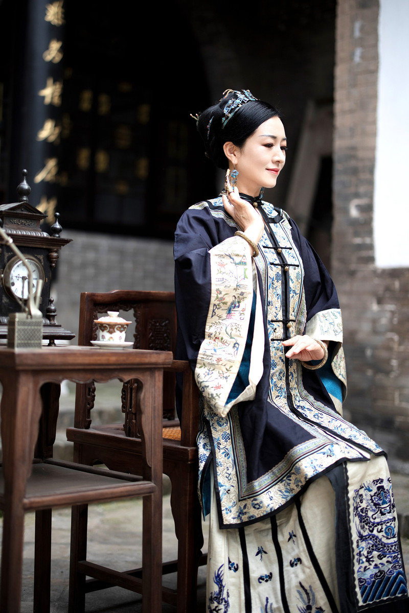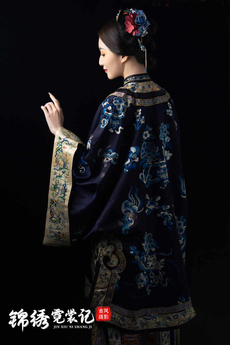 當流蘇垂落額前的剎那,鏡中人影與牆上泛黃的老照片產生了奇妙的重疊。這些古董衣每都有專屬身份文牒,這件十團五彩誥命吉服,曾見證過某位晉商夫人的敕封之禮。