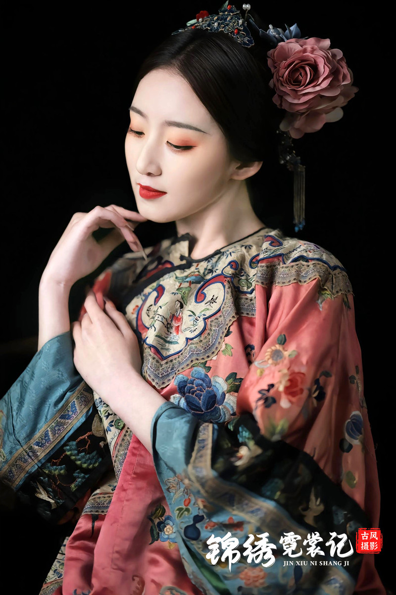 在展示廳看到成片時,驚覺影像中不僅凝固了華服盛景。那張倚在閨閣月洞門邊的側影,錦緞上的摺痕彷彿訴說著舊時女子的禁錮,我不禁慨嘆,這些古董何嘗不是歷史的證人?