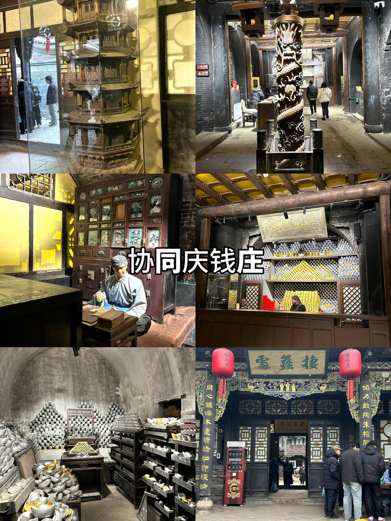 早上先去協同慶票號,這地方可是個“地下金庫博物館”!跟著導遊下到八米深的地下,一抬頭,好傢伙,那金庫頂上雕著龍,銀錠子碼得整整齊齊,牆上“匯通天下”四個大字金光閃閃的。當年協同慶用這點兒本金就能崛起,真是厲害!