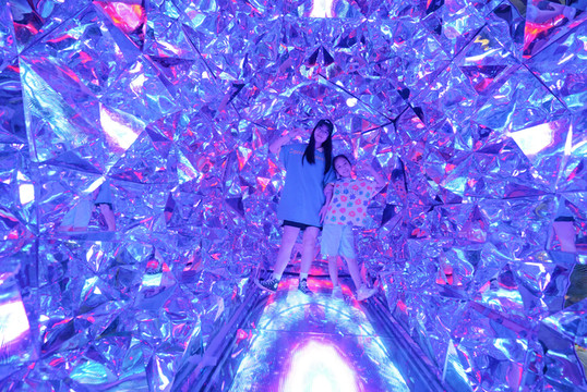 一條隧道裡藏著萬花筒,很好看,很多人排隊進去,拍出生活中沒有的照片。